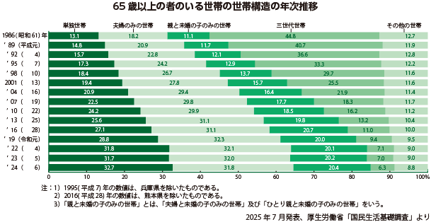 2025年7月に厚生労働省が発表した「国民生活基礎調査」によると、2024年の全国の世帯総数5482万5千世帯に対し、高齢者世帯は全体の31.4%にあたる1720万7千世帯、さらに「高齢者の単独世帯」に限ると903万1千世帯となっています。2013年の調査と比べると、573万世帯だったところから330万世帯以上増えており、加速的に増加していることがわかるでしょう。